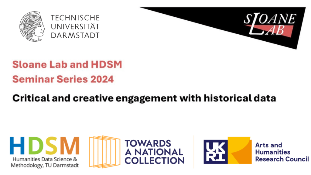 The Sloane Lab symposium series 2024 “Critical and creative engagement with historical data” were facilitated in collaboration with the Humanities Data Science & Methodology (HDSM) Oberseminar of TU Darmstadt, the UCL Centre for Digital Humanities (UCLDH) and the UCL Institute for Advanced Studies (UCL IAS). This seminar invites international speakers whose work is situated at the intersections of collections as data, cataloguing histories and critical archival studies, heritage infrastructures, critical digital heritage, and information science.