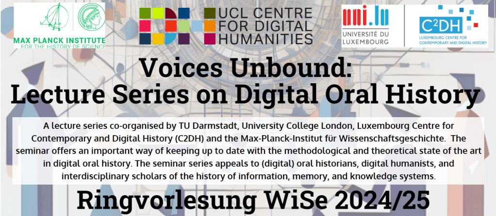 About: A lecture series co-organised by TU Darmstadt, University College London, Luxembourg Centre for Contemporary and Digital History (C²DH) and the Max-Planck-Institut für Wissenschaftsgeschichte. We invited speakers to present work on recent technological developments that may hold promise for digital oral history. The seminar series aims to appeal to (digital) oral historians, digital humanists and scholars of the history of information, memory, and knowledge systems.