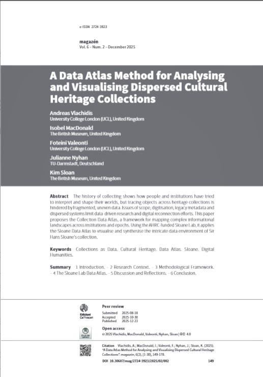 2025. Vlachidis, Andreas; MacDonald, Isobel; Valeonti, Foteini; Nyhan, Julianne; Sloan, Kim; A Data Atlas Method for Analysing and Visualising Dispersed Cultural Heritage Collections. magazén , 6 (2) 10.30687/mag/2724-3923/2025/02/002.