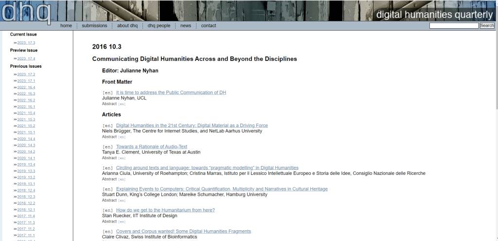 Nyhan, J. Guest Editor of a special issue on the topic ‘Communicating Digital Humanities Across and Beyond the Disciplines’ Digital Humanities Quarterly 10.3. (Open access)